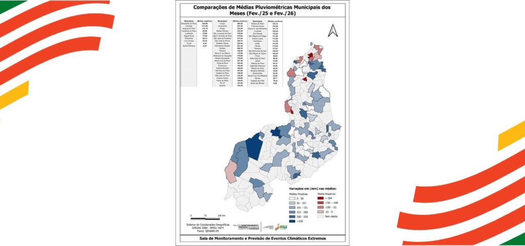 A análise comparativa das médias pluviométricas municipais revela um comportamento climático distinto entre janeiro e fevereiro deste ano, no Piauí. De acordo com levantamento da Secretaria de Estado do Meio Ambiente e Recursos Hídricos (Semarh), enquanto o primeiro mês de 2026 foi marcado por predominância de anomalias negativas, com redução significativa nos acumulados médios em relação a janeiro do ano passado, fevereiro apresentou uma reversão consistente do cenário, com chuvas mais intensas e melhor distribuídas em praticamente todas as regiões do estado.