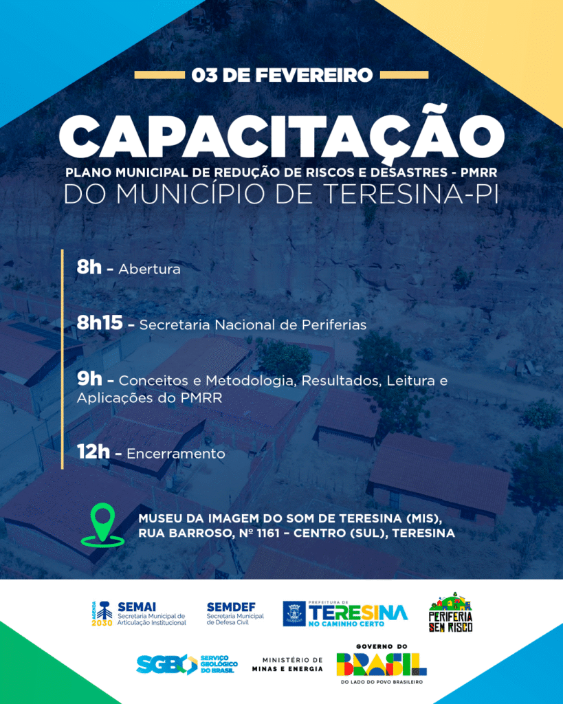 A iniciativa faz parte das ações do Plano Municipal de Redução de Riscos (PMRR) e é realizada pela Secretaria Nacional de Periferias, do Ministério das Cidades, e pelo Serviço Geológico do Brasil (SGB), com o apoio da Secretaria Municipal de Defesa Civil de Teresina (Semdef) e de Articulação Institucional (Semai), por meio da Coordenação Agenda Teresina 2030.