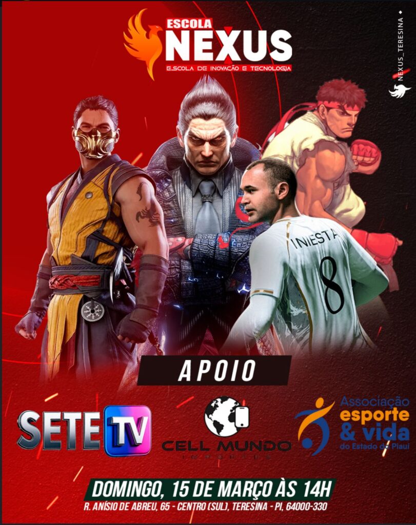 O evento acontece no prédio da Escola Nexus Teresina e é aberto a alunos e à comunidade em geral. A organização convida o público para participar e prestigiar o encontro, que promete reunir fãs de games, tecnologia e cultura geek em uma tarde de entretenimento na cidade.
