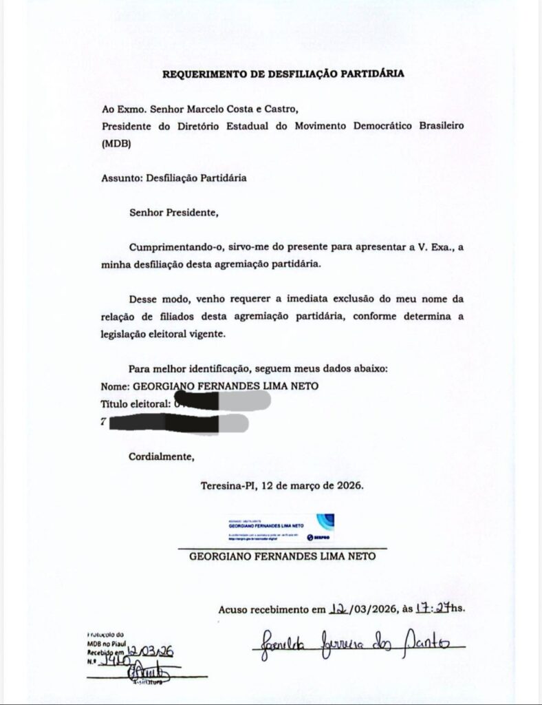 O documento esta endereçado ao presidente estadual da legenda, o senador Marcelo Castro. Segundo interlocutores a sua saída foi motivada pelo possível fim da chamada aliança cruzada entre MDB e PSD.