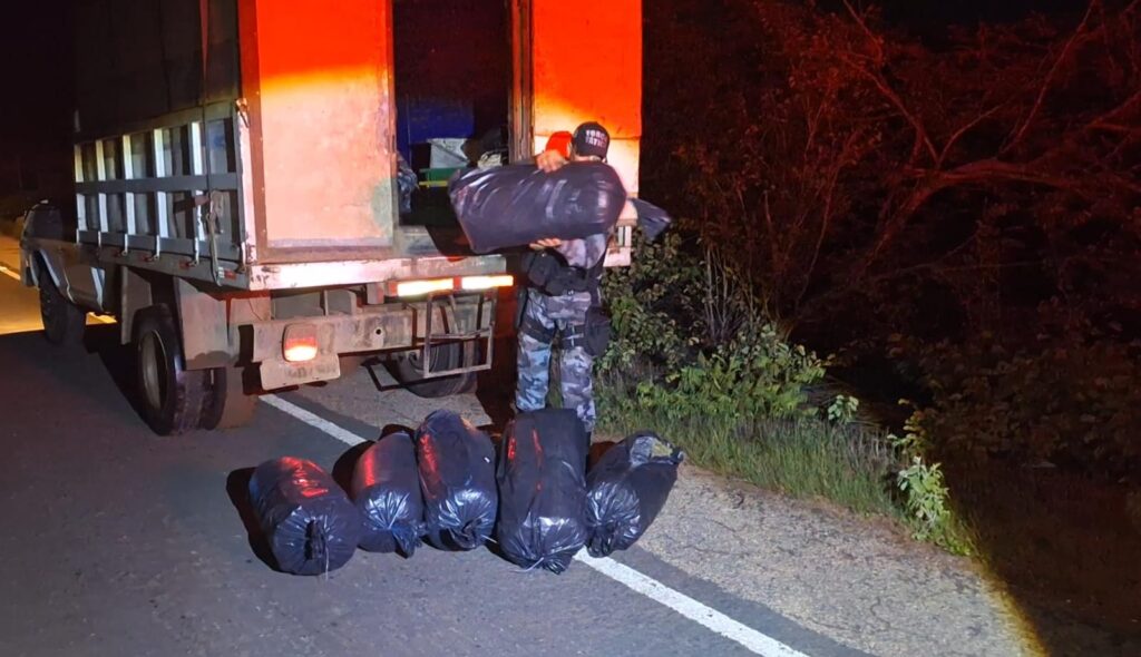 De acordo com a PM, estava sendo feito um policiamento de rotina, quando por voltas das 21h30 os policiais abordaram um veículo de carga que transitava pela rodovia. Durante a vistoria, foram encontrados 13 sacos plásticos pretos com susbstância semelhante à maconha.