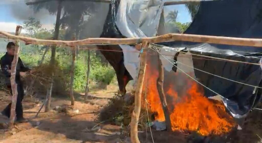 “Localizamos um plantio de maconha aqui na zona rural de São João dos Patos, os indivíduos vinham do Estado de Pernambuco, inclusive utilizavam sistema moderno de irrigação, tipo gotejamento. Encontramos maconha já pronta para retirada aqui, aproximadamente dois metros, parte já estava inclusive ensacada, já pronta para comercialização, e essa ação conjunta resultou nesse grande trabalho aqui de localização, e agora a gente vai fazer a destruição desse entorpecente”, explica o delegado Charles Pessoa.