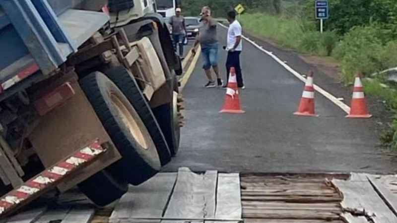 Segundo informações preliminares, o caminhão trafegava pela ponte quando parte da estrutura não suportou o peso e cedeu sob as rodas do veículo, que ficou retido entre as tábuas rompidas. Não há relatos de feridos até o momento, mas a situação causou retenção de veículos nos dois sentidos da rodovia.
