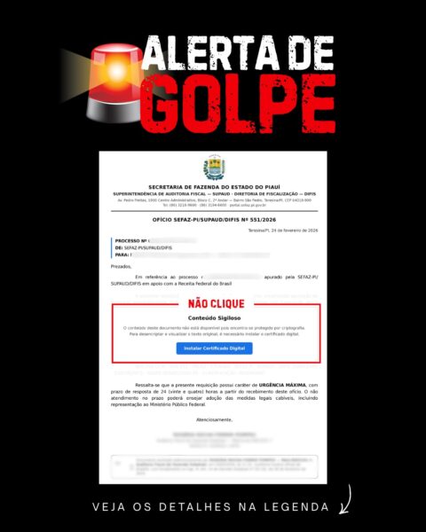 A Secretaria da Fazenda do Piauí (Sefaz), alertou nesta quarta-feira (25), contribuintes sobre a circulação de e-mails e mensagens falsas que usam o nome do órgão para aplicar golpes. As mensagens simulam cobranças, auditorias fiscais e até pedidos de instalação de certificados digitais.
