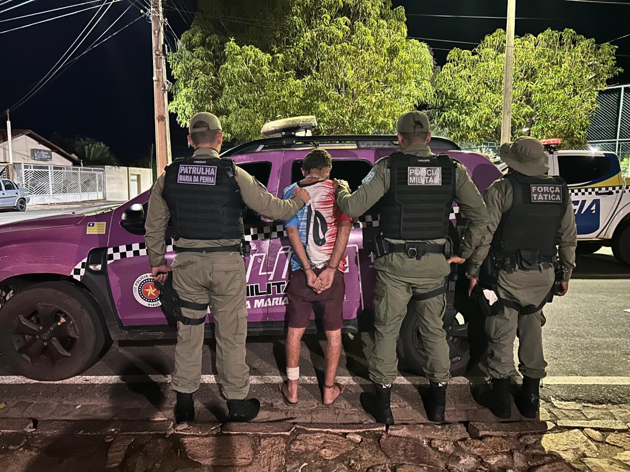 Durante as buscas, os policiais localizaram o homem escondido na residência do próprio pai. Ao perceber a aproximação das equipes, ele tentou fugir pulando o muro do imóvel, mas foi rapidamente contido.