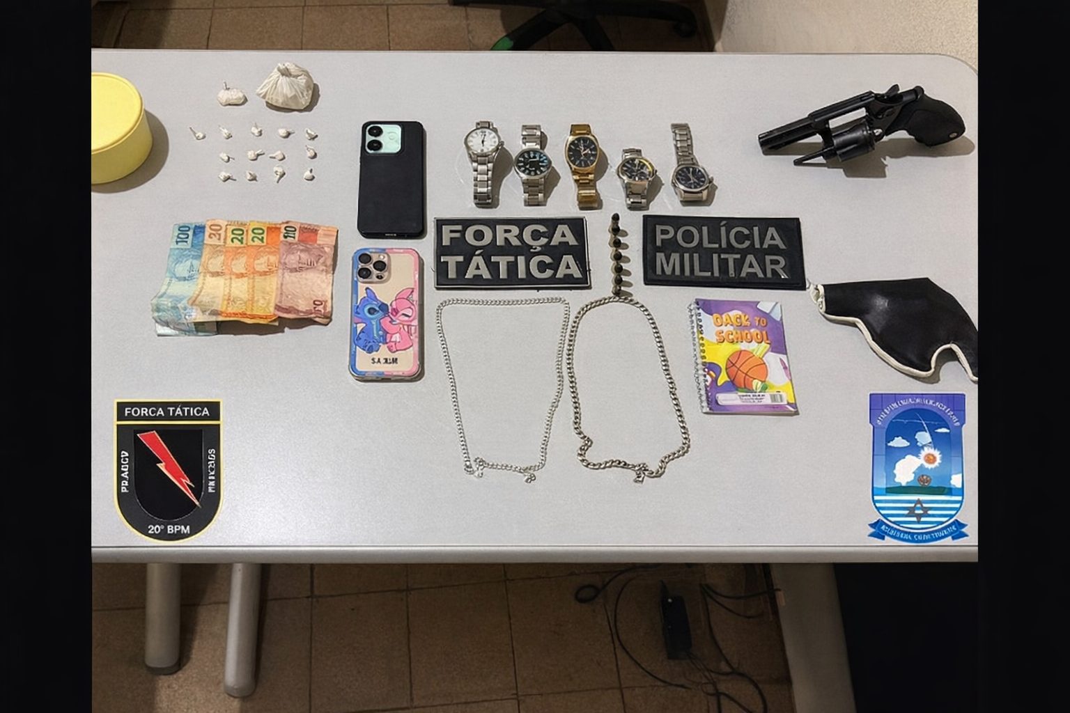Segundo informações da polícia, o suspeito estava com um revólver calibre .38, com seis munições intactas. Entre os materiais apreendidos estavam cinco relógicos, 13 papelotes prontos para comercialização de substância análoga à cocaína, outra porção da mesma droga ainda em forma de pedra e uma quantia em dinheiro.